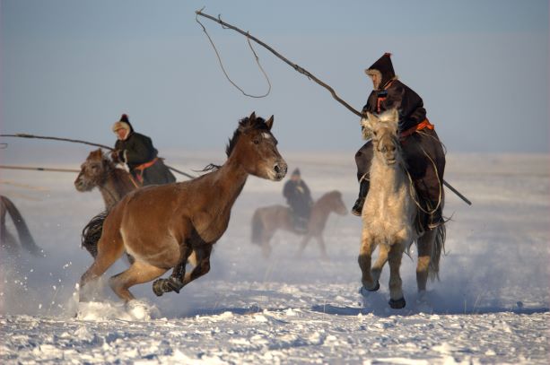 In China, the sturdy and unpretentious steppe horses are kept by their owners to roam free outdoors, where in Inner Mongolia the summer can reach 25°C and winter fall to -30°C, and are given no hay or other extra feed at any time of the year. The stallions in winter protect their harems and young offspring from wolves. Primarily employed for riding and carting, the horses are also used for their meat and for the production of airag, a fermented horse milk, which is an important staple for the Mongolian people who have few vegetables in their diet.